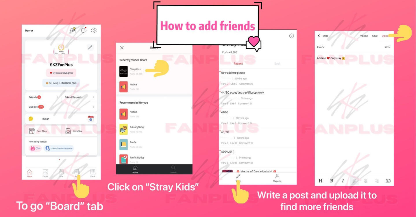 ADD FRIENDS(Get more friends by posting on SKZ’s Board so others know to add you! Set profile pic to your FanPlus certificate so other Stays know you are trustworthy and are more likely to add you~)